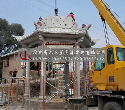 九龍星園林古建石材六角亭石亭子安裝現(xiàn)場