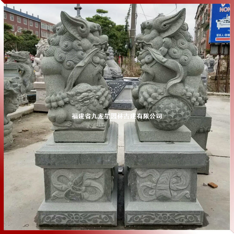 南派石獅子雕刻豐富,多彩有別,獻錢獅則是南派石獅子造型代表之一,因其以飾一串古錢而得名。因此,獻錢獅有著招**進寶的寓意,因為造型憨態(tài)可掬,少了幾分獅子的威嚴,多了幾分靈性,雄獅常飾于大串的銅錢,寓意招**進寶。而雌獅則戲玩著小獅子,寓意人丁興旺之意,同樣也是人們熱衷于選擇的造型之一。獻錢獅是中國石雕獅子造型中常見的一種,同樣常見的還有北方傳統(tǒng)的京獅石雕獅子。