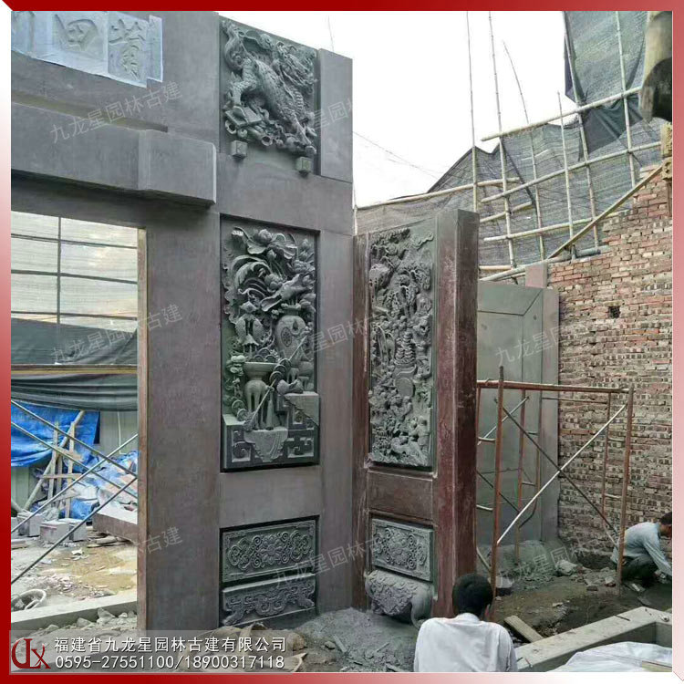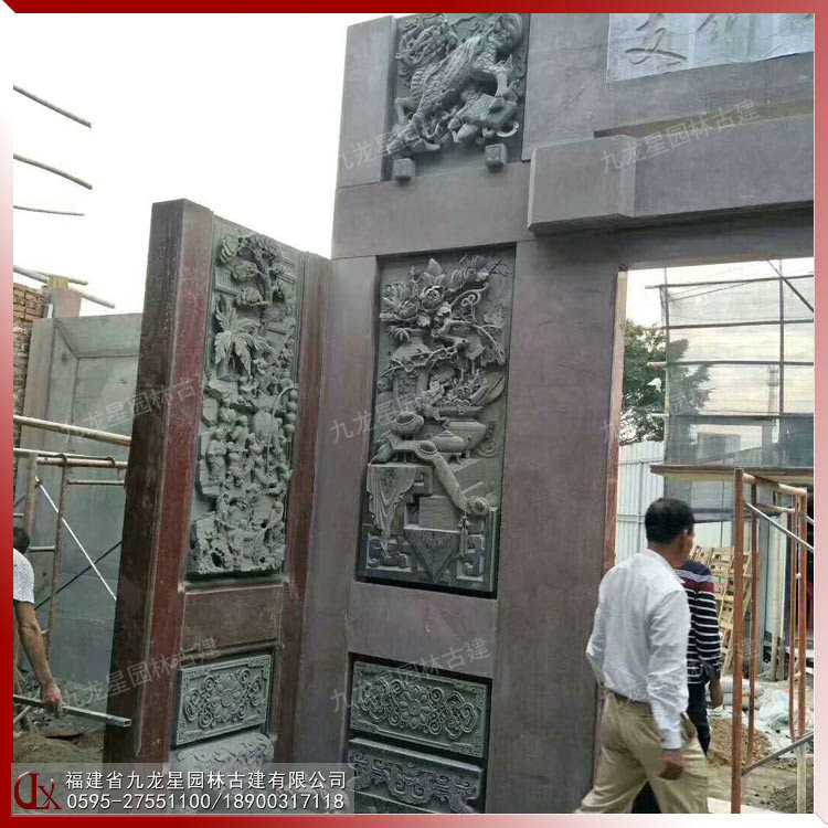 石雕浮雕壁畫在潮汕祠堂中占了重要的地位。宗祠門面浮雕在內容、形式和材質上與圓雕一樣豐富多彩。下圖是九龍星園林古建案例-潮汕祠堂門面獅象浮雕圖 浮40公分。